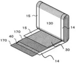 對于卷繞電池,有一種全極耳極片設(shè)計,從極耳角度提高了電池功率特性,在大倍率下電流密度分布均勻,具體的極片設(shè)計如圖2所示。正極極片在涂敷正極材料(30)時一側(cè)邊緣不涂布的側(cè)面(15)和負極極片涂覆負極材料(40)時留白的一側(cè)面(14)都作為極耳分別焊接在正負極導(dǎo)流體上,正負極極片之間通過隔膜(170)隔離開,這樣電流流經(jīng)的距離短,可以實現(xiàn)高功率密度,極片發(fā)熱量也小。