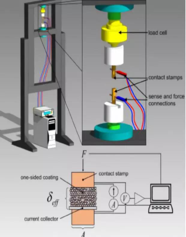 具體的測(cè)量裝置示意圖如圖7所示,將測(cè)試探頭安裝在材料力學(xué)性能測(cè)試設(shè)備上,非常容易實(shí)現(xiàn)極片電阻的測(cè)量,測(cè)量過程中,主要的參數(shù)包括加載電流和探頭施加壓力。最終,所測(cè)量的電阻率ρ由以下公式計(jì)算: