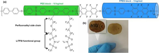 圖1:a)SI10-05離聚物的分子結(jié)構(gòu),親電性PES嵌段以綠色突出顯示,而親電性FPES嵌段以藍(lán)色突出顯示。b)在兩個(gè)聚酯薄膜之間壓制后,SI10-05-70%PC離聚物膜的照片。